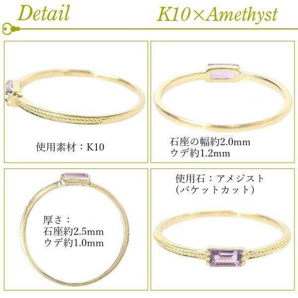 アメジスト リング k10 10k 2月誕生石 天然石 10金 ピンクゴールド k10pg バゲットカット バケット 重ね付け 重ねづけ 華奢 ピンキー 50代 40代 60代 ミル打ち 2×4mm 指輪 レディース 30代 20代 ギフト プレゼント 女性用