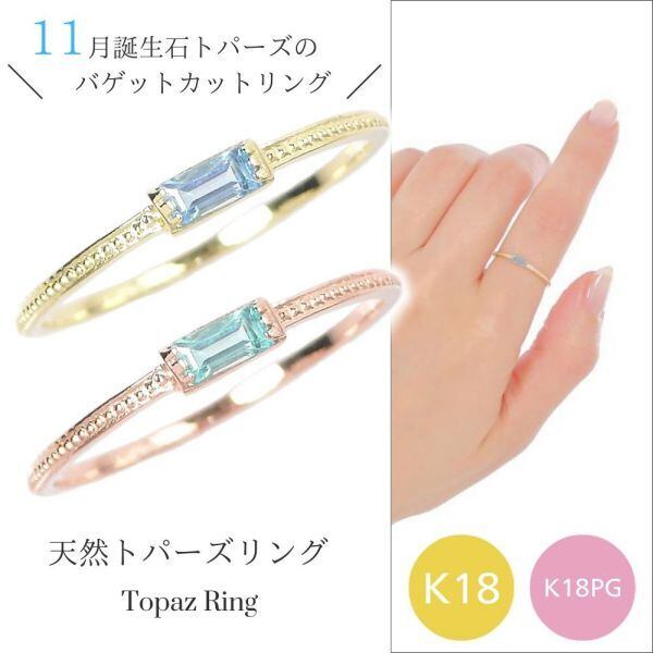 ブルートパーズ リング k18 18k 11月誕生石 天然石 18金 ピンクゴールド k18pg バゲットカット バケット 重ね付け 重ねづけ 華奢 ピンキー 50代 40代 60代 ミル打ち 2×4mm 指輪 レディース 30代 20代 ギフト プレゼント 女性用